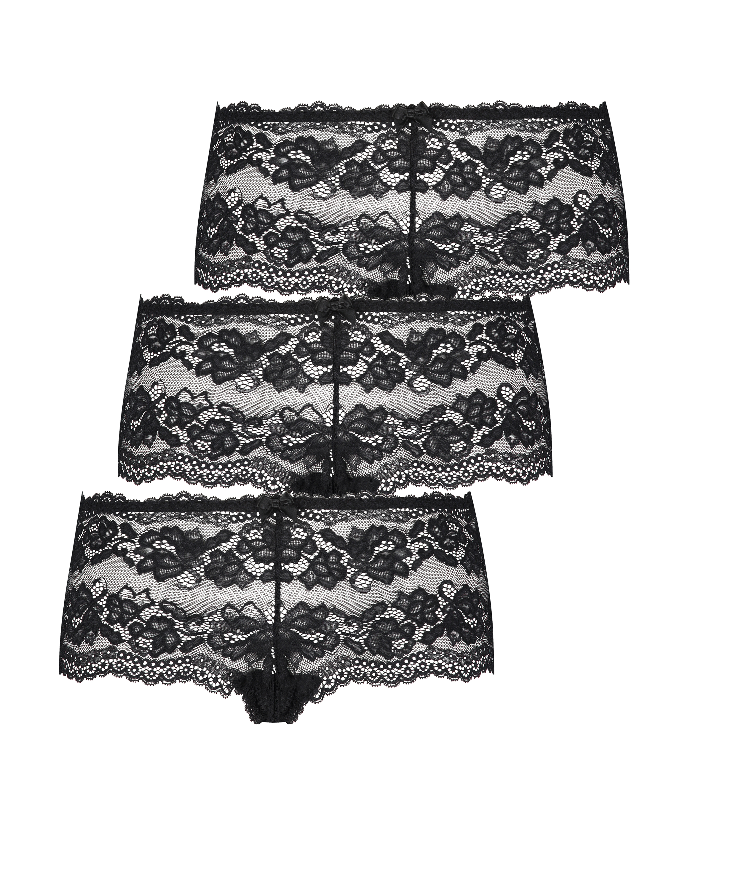 Fühl dich sexy in diesen Boxern! Die Boxer sind komplett mit Spitze gefertigt und verfügen über eine kleine Schleife. Außerdem sind sie in einer praktischen 3er-Packung verpackt. Kombiniere sie mit einem passenden BH!