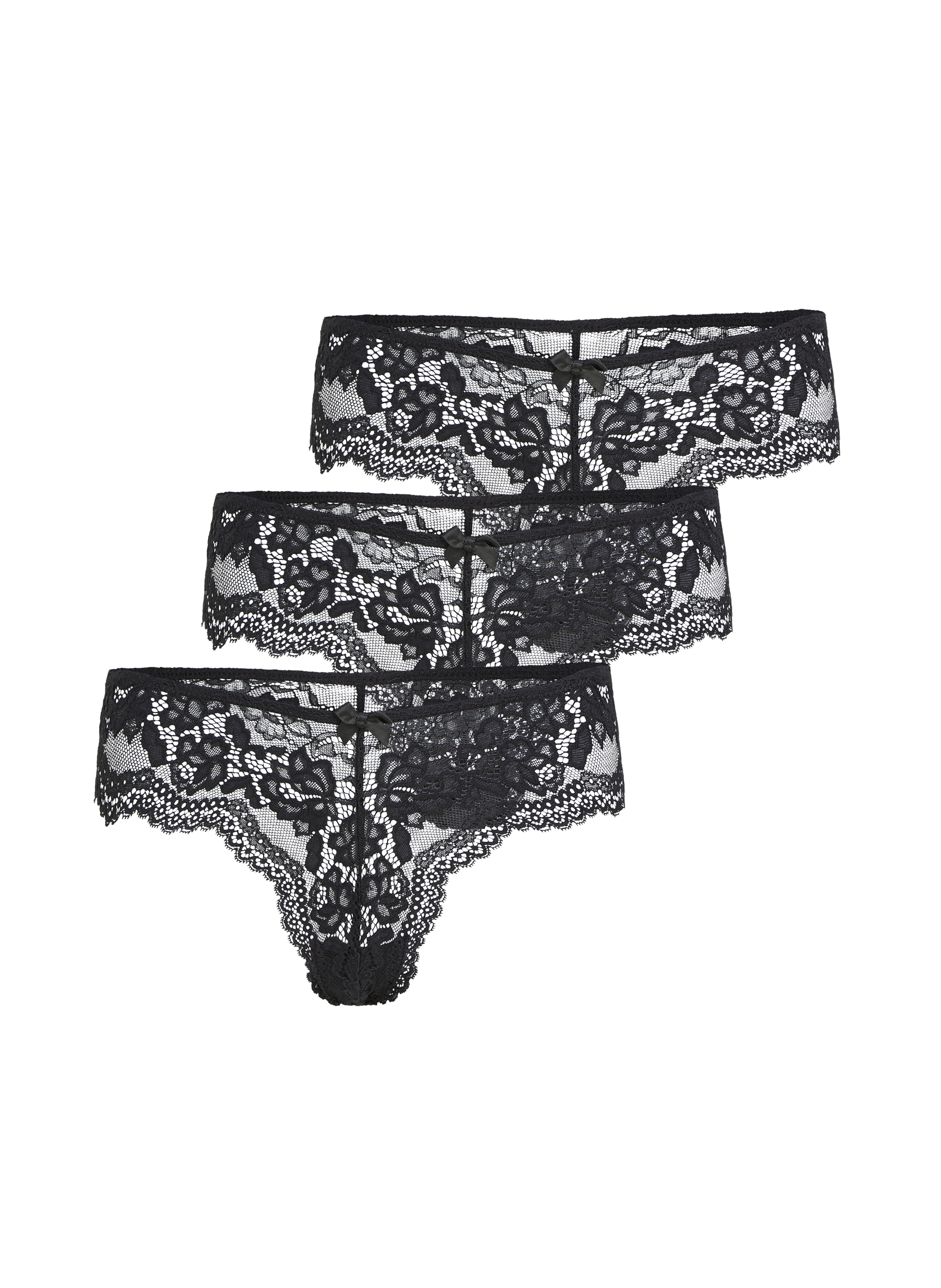 Fühle Dich sexy in diesen Brazilians! Sie sind komplett mit Spitze verarbeitet und haben als zusätzliches Detail eine kleine Schleife auf der Vorderseite. Praktisch im 3er-Pack, damit Du jeden Tag fabelhaft aussiehst.