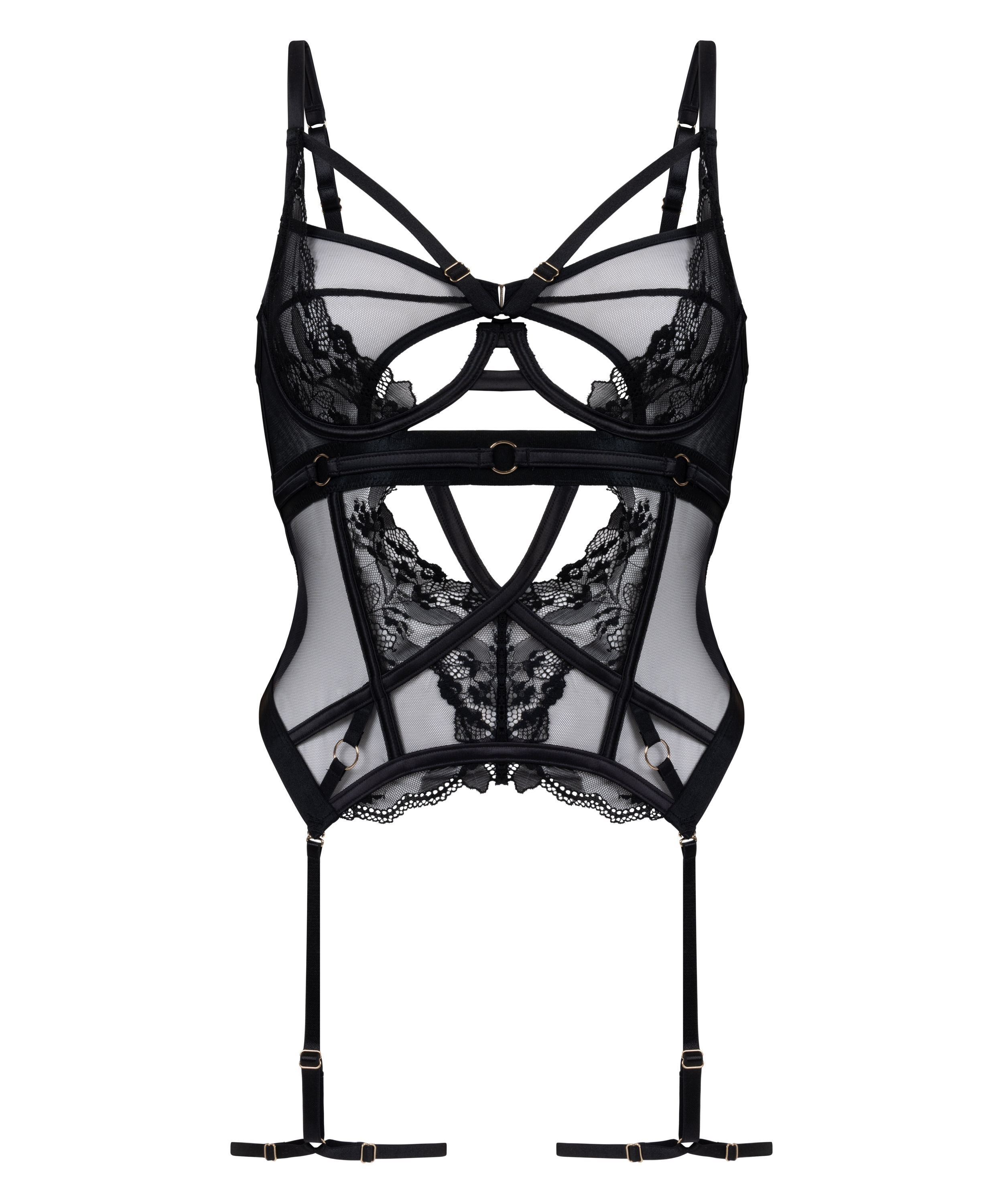 Mit unserem Bustier, einem gewagten und verführerischen Teil, das Eleganz neu definiert, gewinnst du neues Selbstvertrauen. Dieses atemberaubende Design kombiniert Spitze und Mesh und schafft ein fesselndes Spiel der Texturen, das deiner Figur schmeichelt. Die gewagten Cut-out-Details tragen eine verspielte Note bei und machen dieses Bustier zu einem echten Statement.