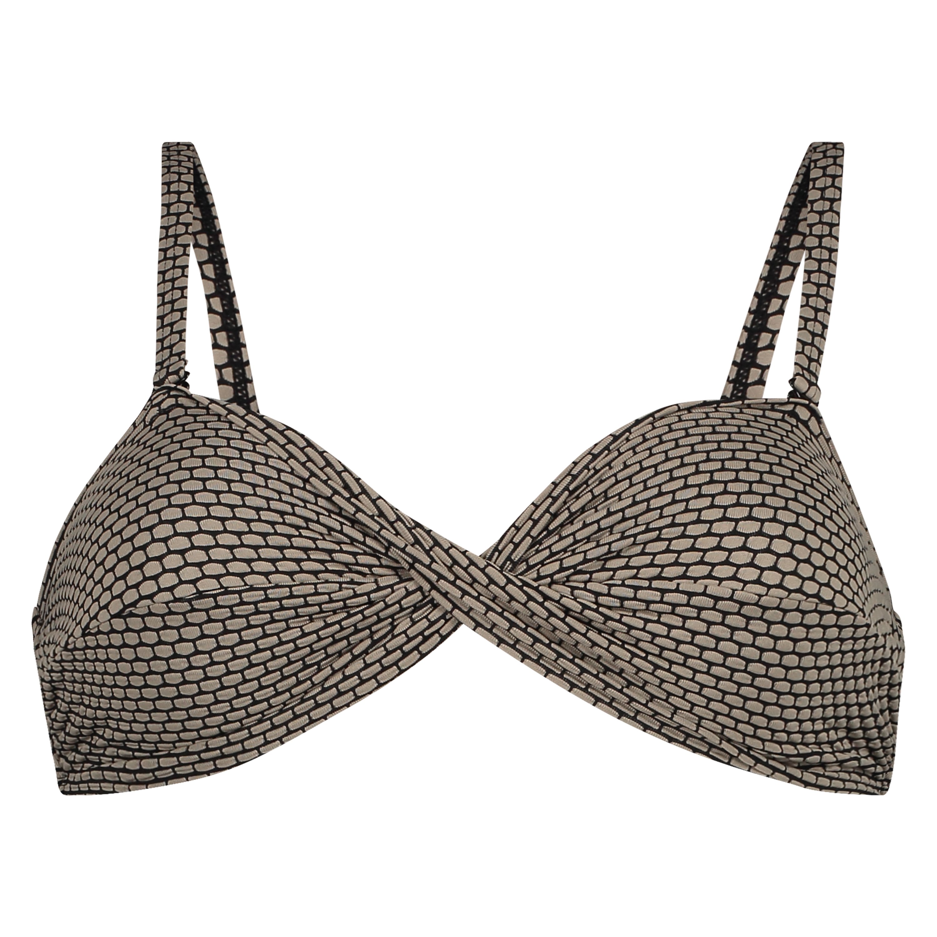 Stehlen Sie mit diesem Bikini-Oberteil jedem die Show! Dieses Bandeau-Top hat vorne ein hübsches Twist-Detail. Das Bikini-Oberteil kann auch trägerlos getragen werden. Das Bikinioberteil hat ein Relief im Stoff. Mit den passenden Artikeln kombinierbar