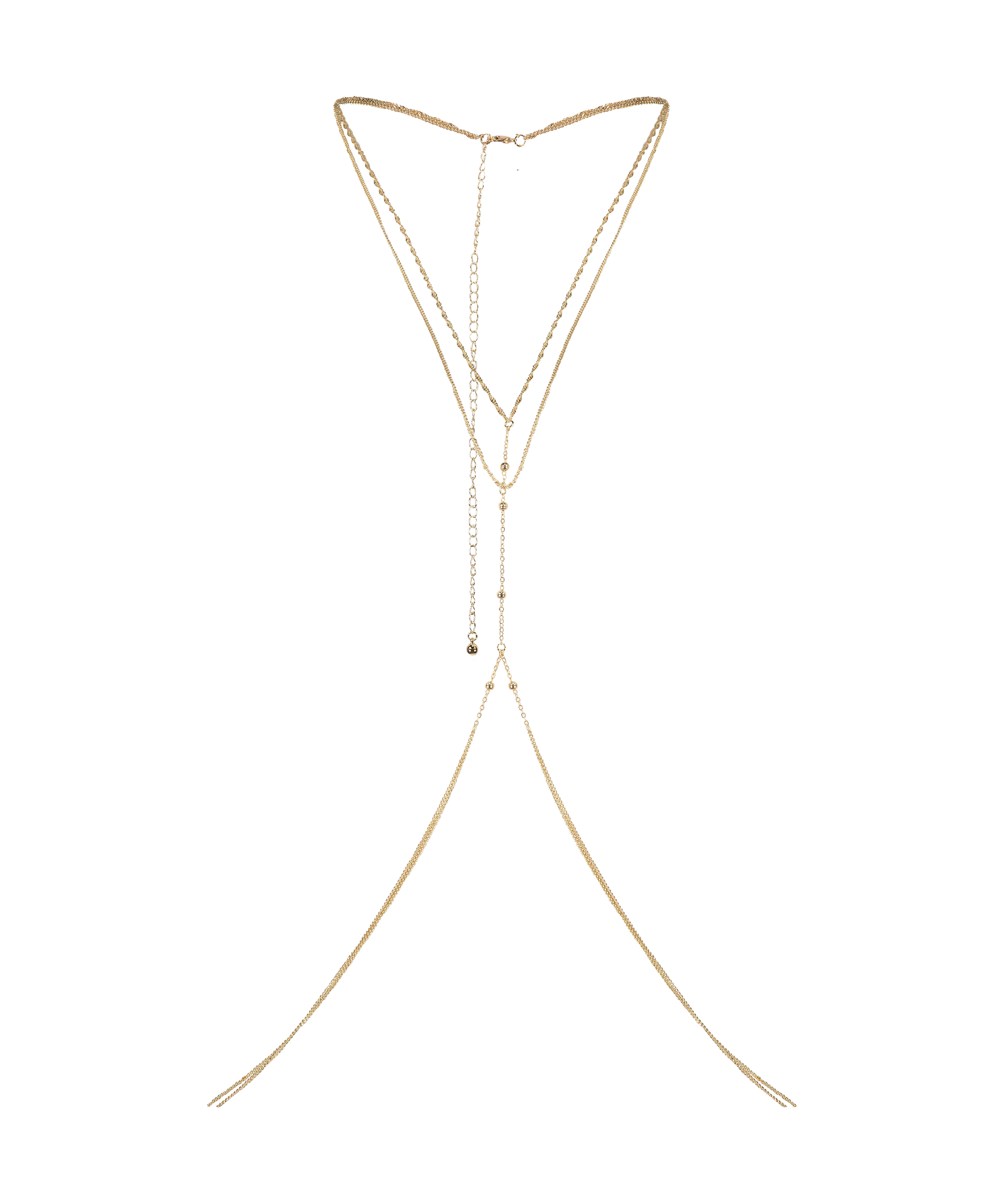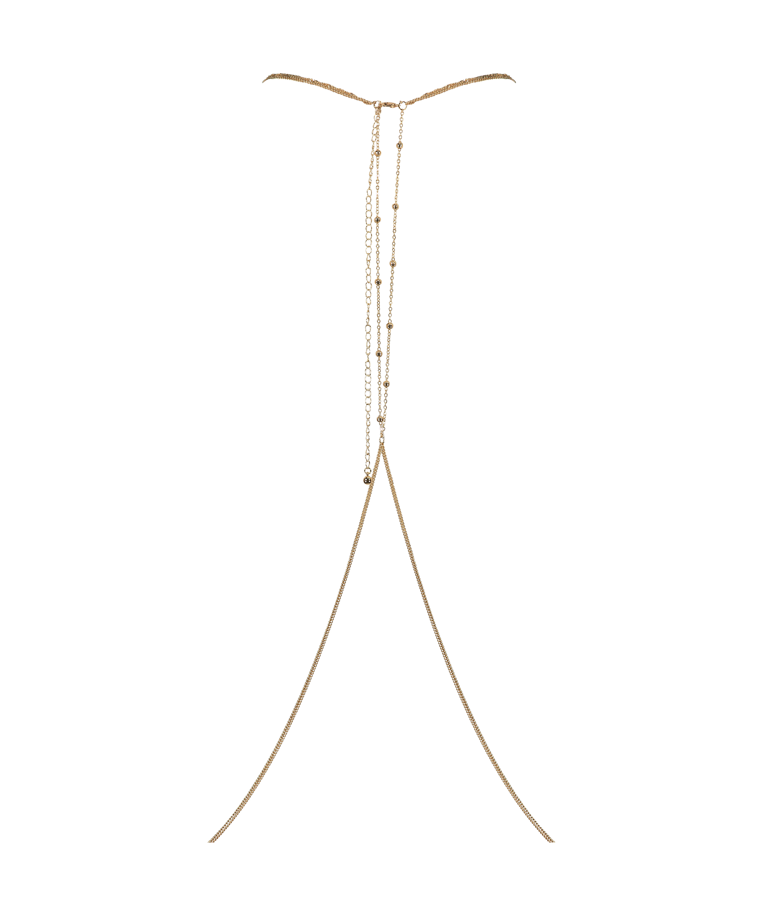 Vervollständige Deinen Look mit dieser schönen Body Chain. Sie ist goldfarben und macht Dein Outfit zum Hingucker.