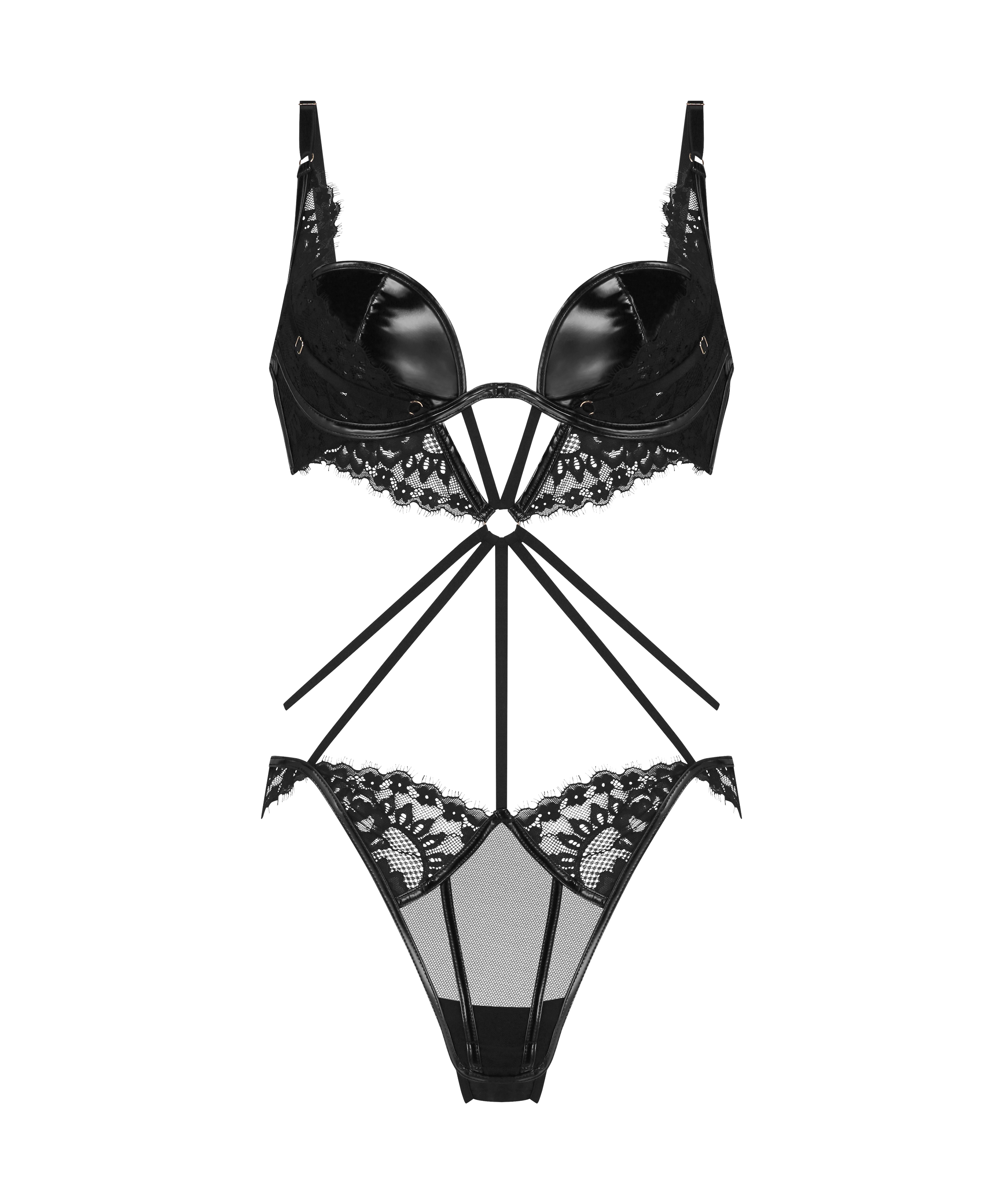 Hinterlasse einen bleibenden Eindruck mit diesem gewagten und freizügigen Body! Der Kali Body zeichnet sich durch Spitzenverzierungen und gerichtete Träger aus. Das wunderschöne Design der Cups sorgt für einen unvergesslichen Look mit einer sanften Bügelunterstützung. Zusammen mit dem Nietenverschluss an der Unterseite, dem offenen Rücken und dem aufreizenden Cut-out-Slip hinten ist dies ein auffälliges Stück. Teil unserer Private Kollektion.