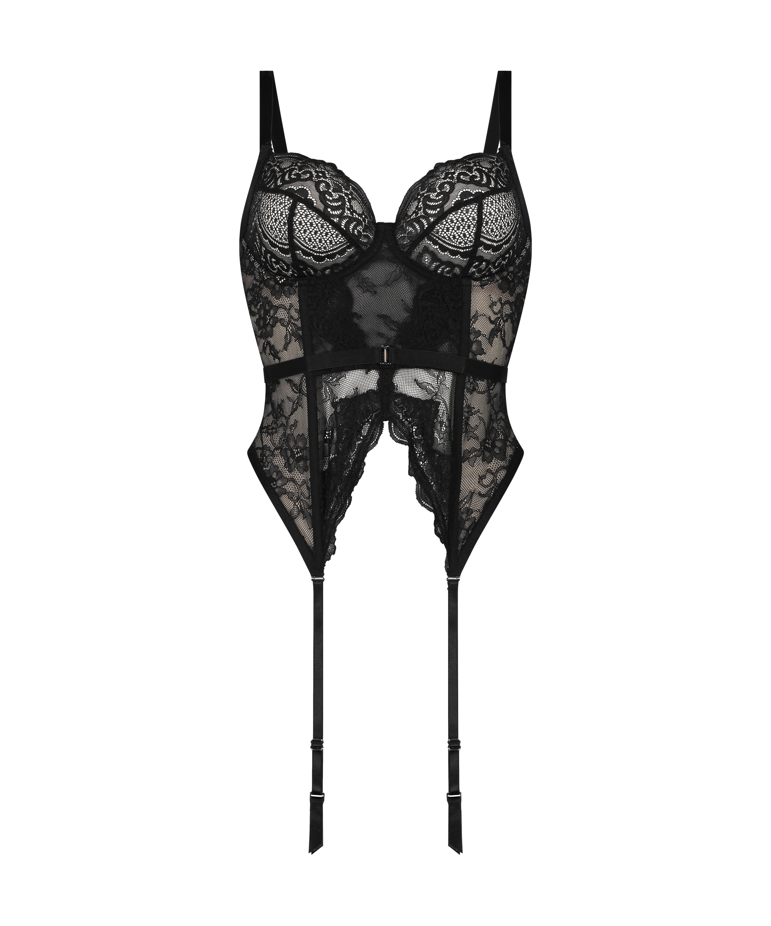 Kreiere mit diesem sexy Bustier einen eleganten Look. Er ist durchgehend aus Spitze gearbeitet und bietet dank der Stäbchen an der Vorderseite eine bequeme Passform. Außerdem kannst du ihn dank der Strumpfhalter mit deinen Lieblingsaccessoires kombinieren. Runde den Look mit einem Kimono und Feinstrümpfen ab.