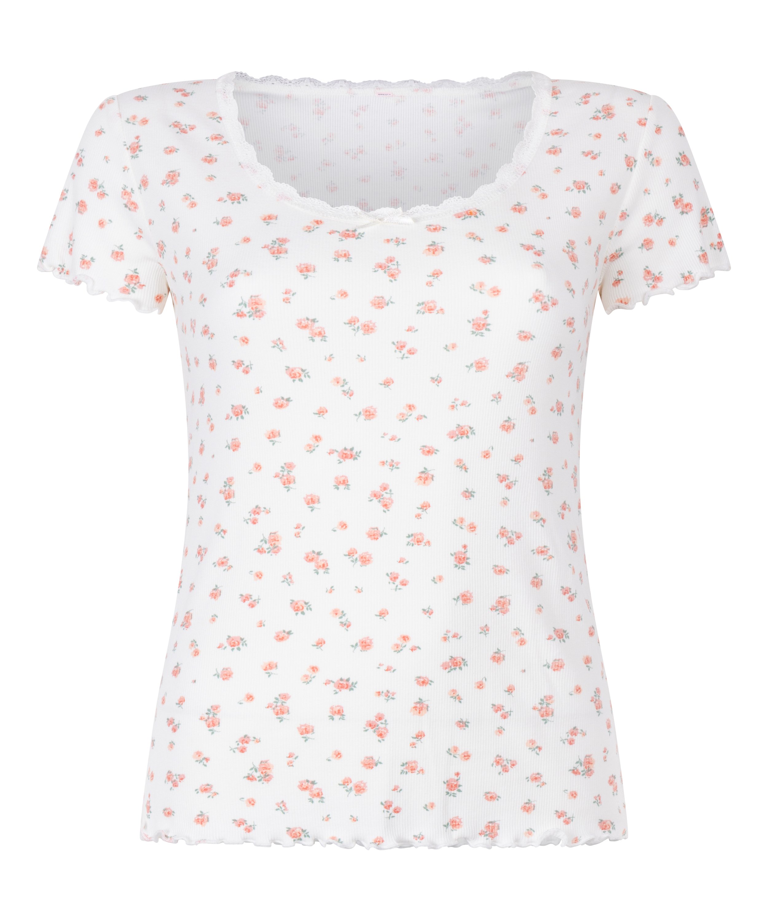 Charmanter Komfort für verträumte Tage! Dieses gerippte Kurzarm-Top hat einen spitzenbesetzten Rundkragen mit einer zarten Schleife und weiche Rüschen an den Ärmeln und am Saum, die Ihnen gemütliche Momente versüßen.