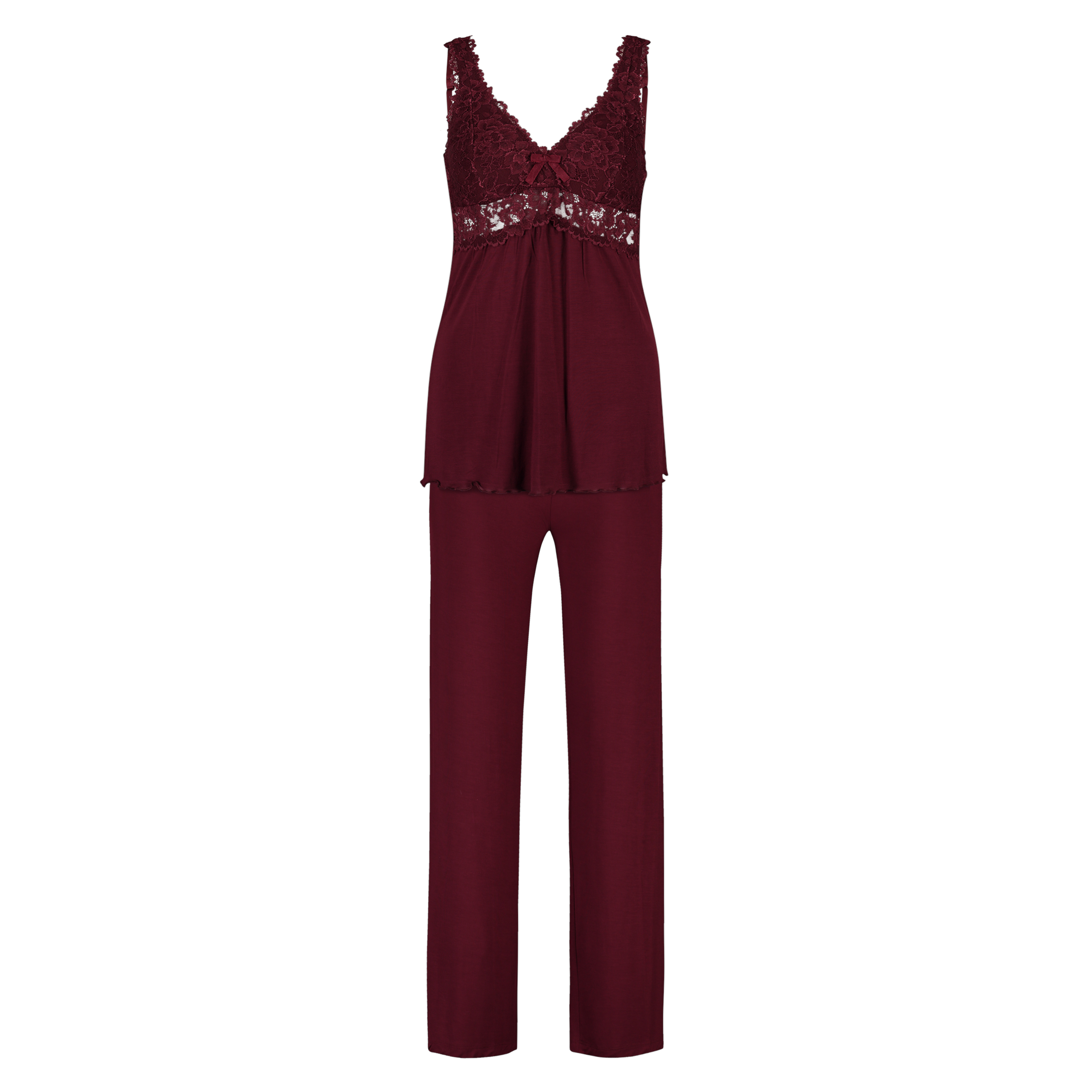 Pyjama composé d’un top à magnifique dentelle, avec des bretelles réglables. Le pantalon de pyjama assorti a une taille élastiquée.