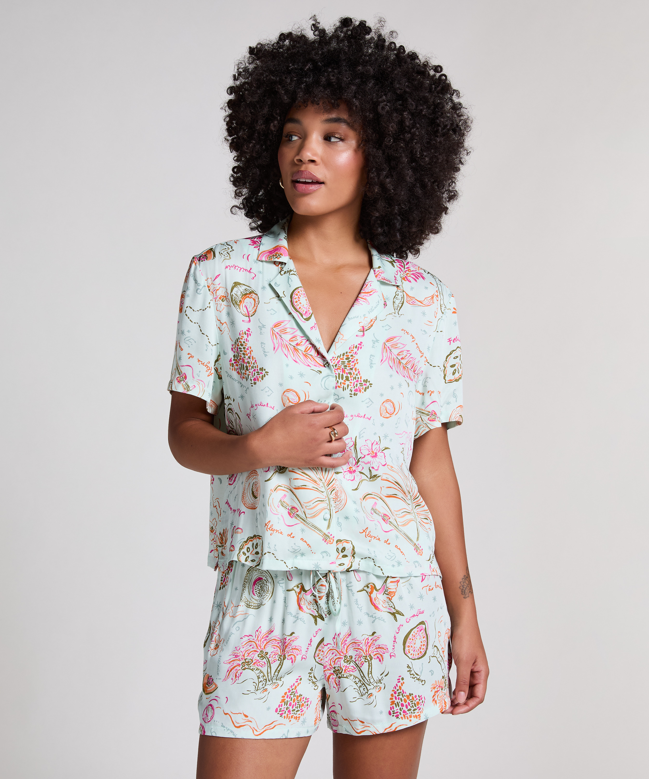 Dieses Schlafshirt weichem, leichtem Stoff verspricht höchsten Komfort für erholsame Nächte. Der elegante gefaltete Kragen und der V-Ausschnitt verleihen ihm einen Hauch von Raffinesse. Mit Stoff bezogene Knöpfe vervollständigen das raffinierte Aussehen – für geruhsame Nächte mit Stil.