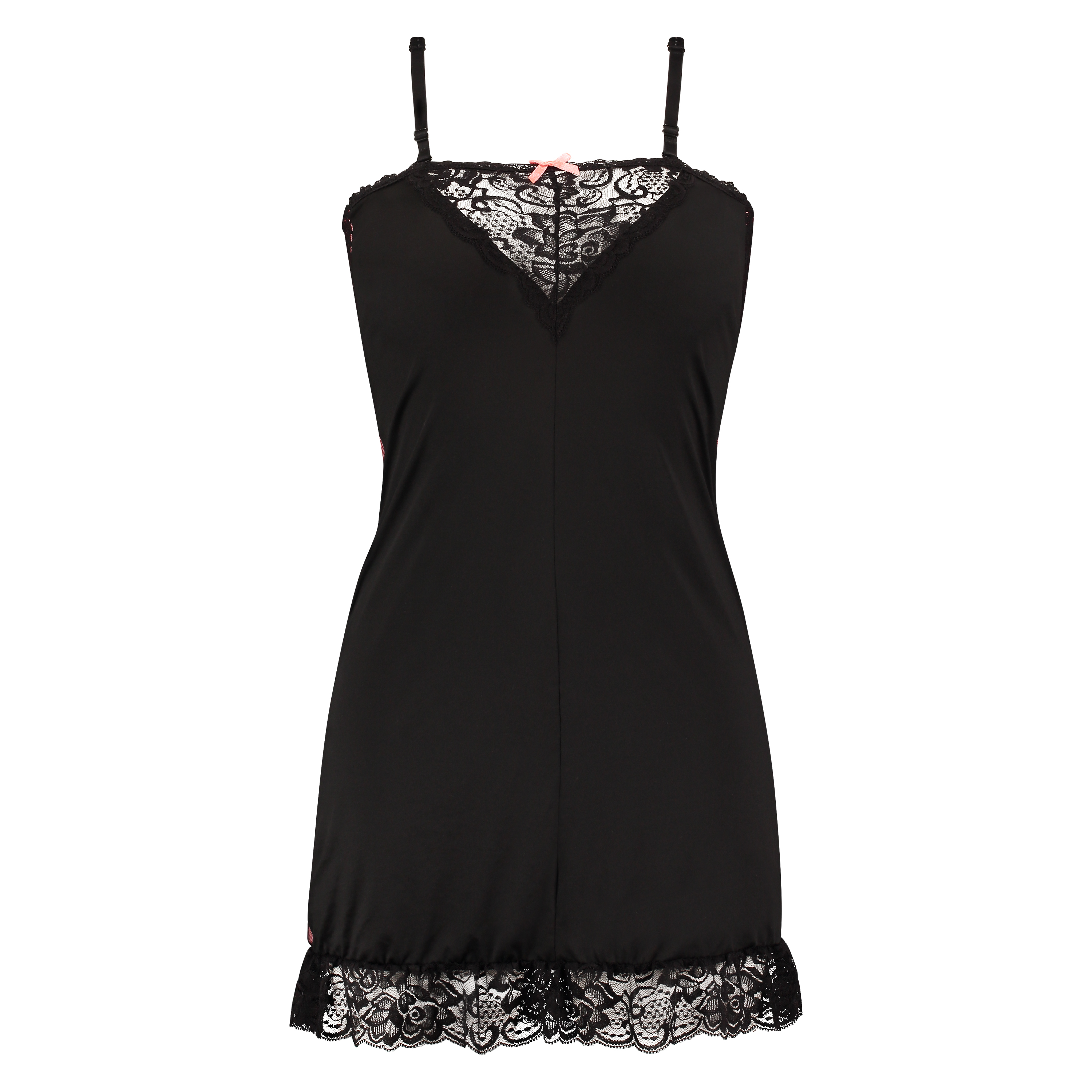 This elegant slip features a nude colour on the front covered by black semi-transparent lace. The back is plain black with a lace detail. The slip is finished with lace edging along the bottom.