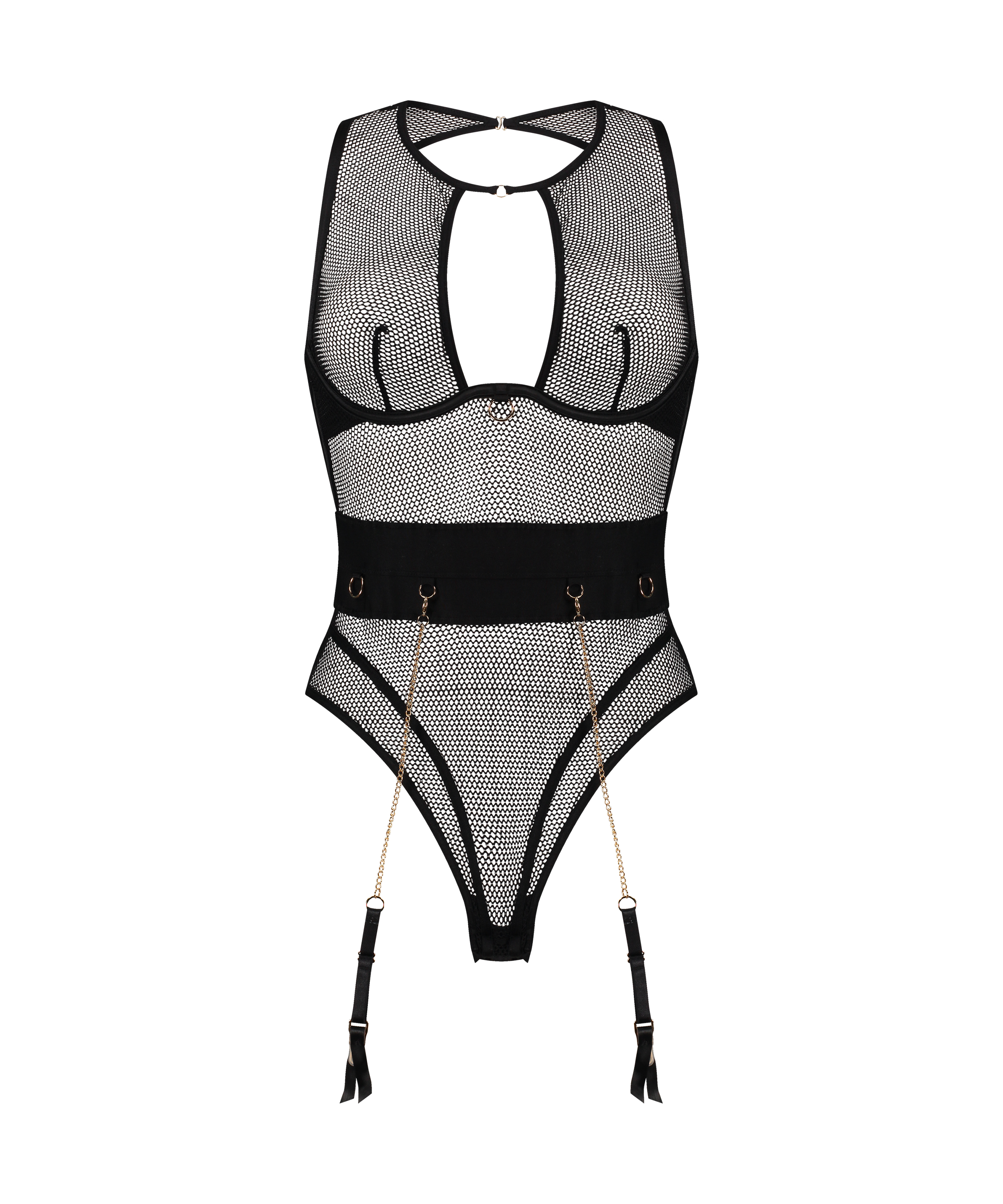 Ce body est en tissu maille délicat avec une coupe flatteuse. Le design comprend un détail de ceinture unique avec des accents dorés et des bretelles ajustables.
