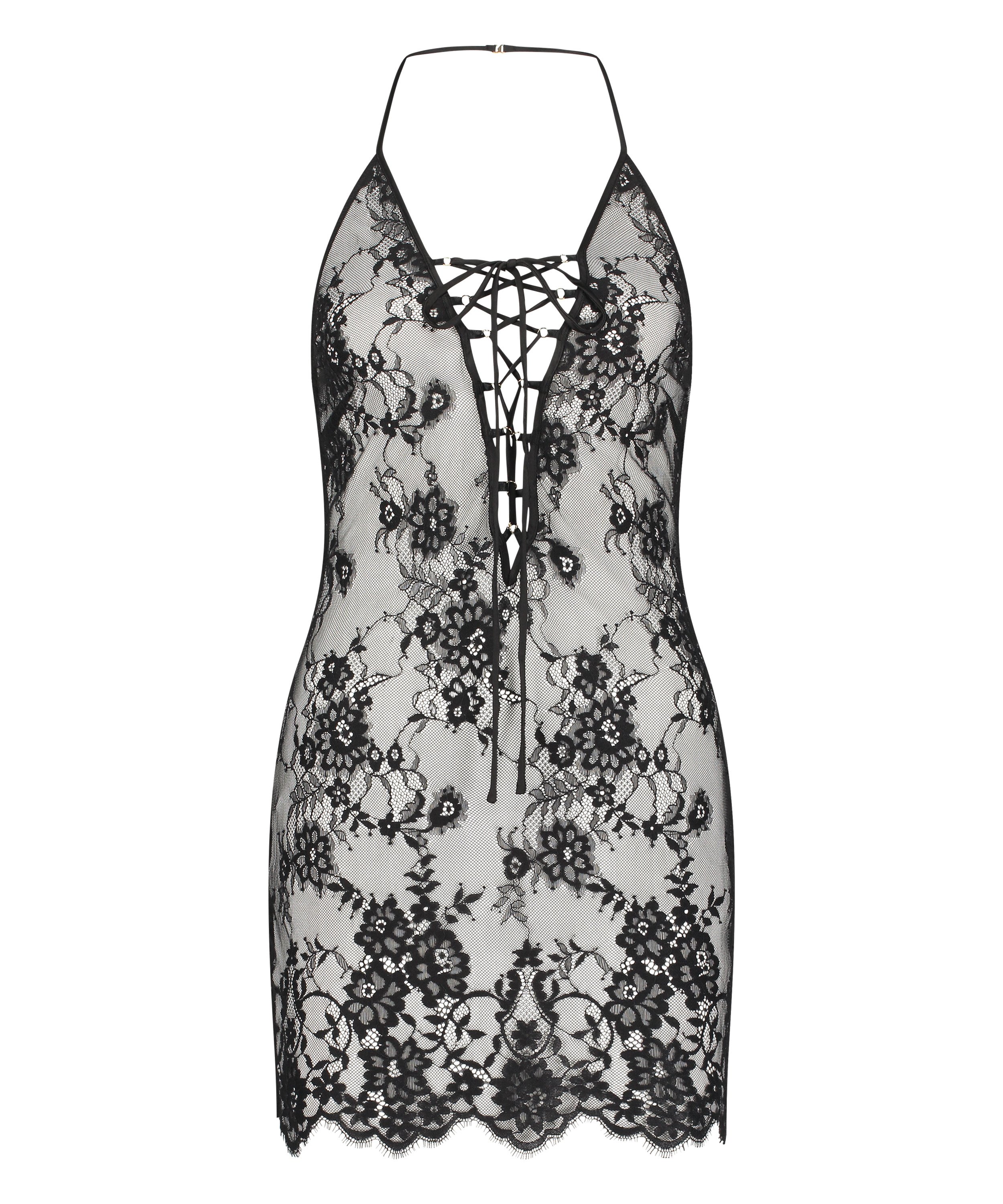 Soyez fabuleuse dans notre nuisette dos nu en dentelle ! Réalisée en dentelle, cette robe semi-transparente est dotée d'un col licou. Associez-la à un joli kimono pour parfaire votre look de soirée.