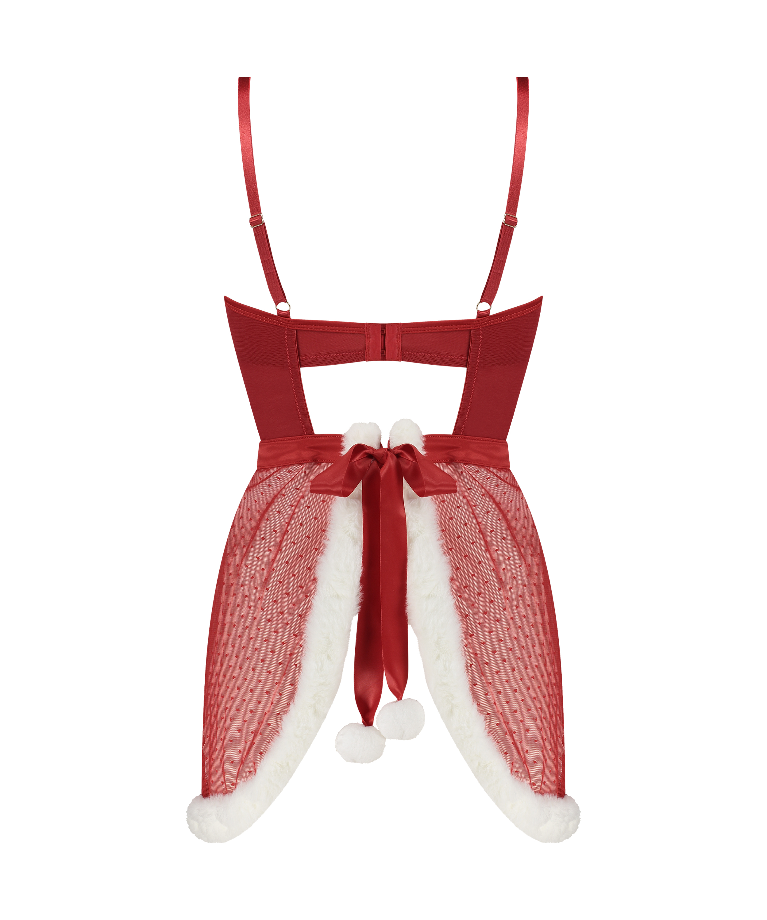 Faites la fête avec cette nuisette Noël sexy ! Un look tout en transparence avec un ruban sur le devant. Sans oublier la fausse fourrure décorative et les pompons à l'arrière. À assortir à d'autres accessoires de la collection privée.