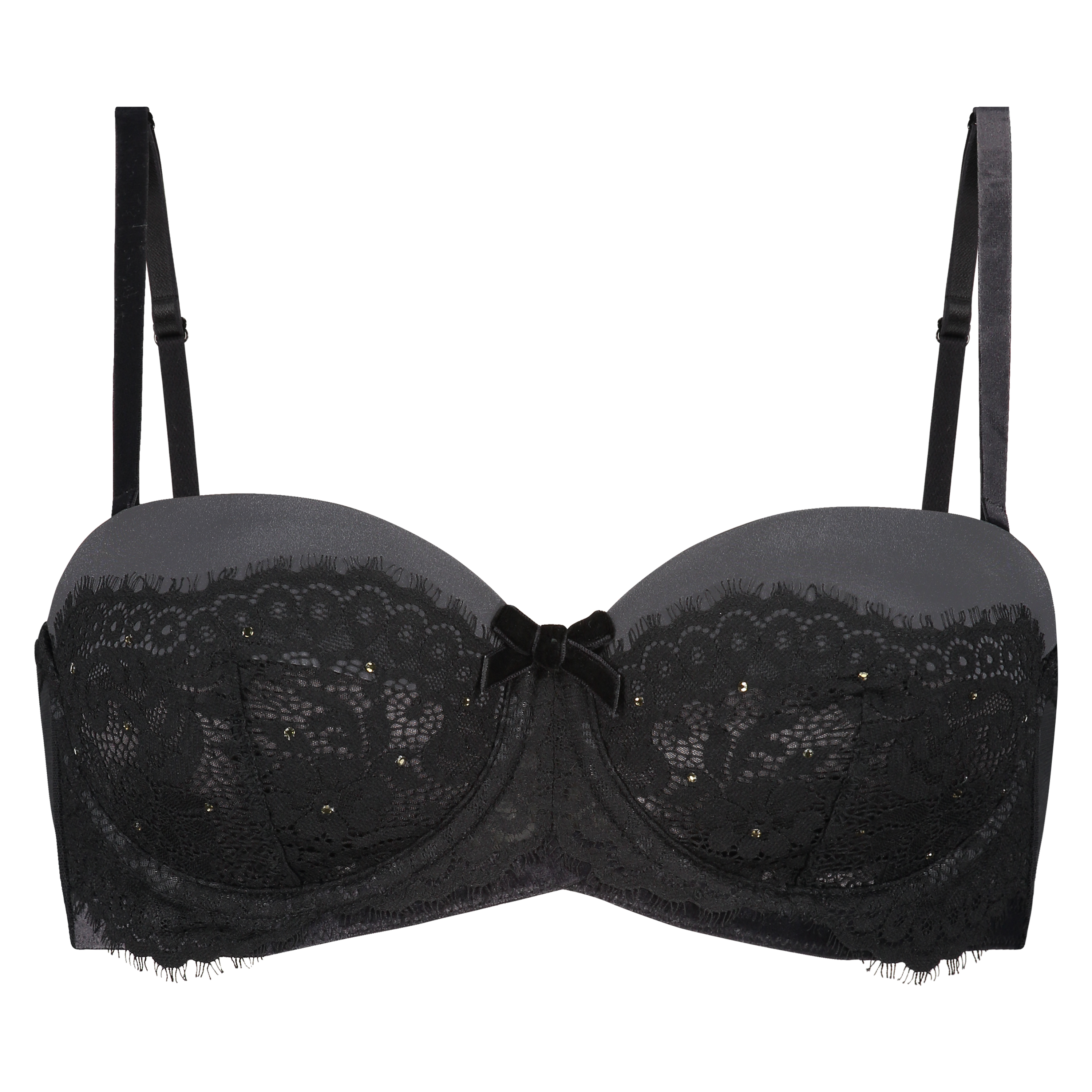 Ce soutien-gorge en dentelle est un véritable must ! Les bonnets sont parachevés avec de la dentelle et des petits strass. Il y a un petit nœud en velours entre les bonnets. Le soutien-gorge peut se porter avec ou sans bretelles. A combiner avec les éléments assortis pour créer l'ensemble parfait.