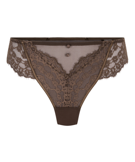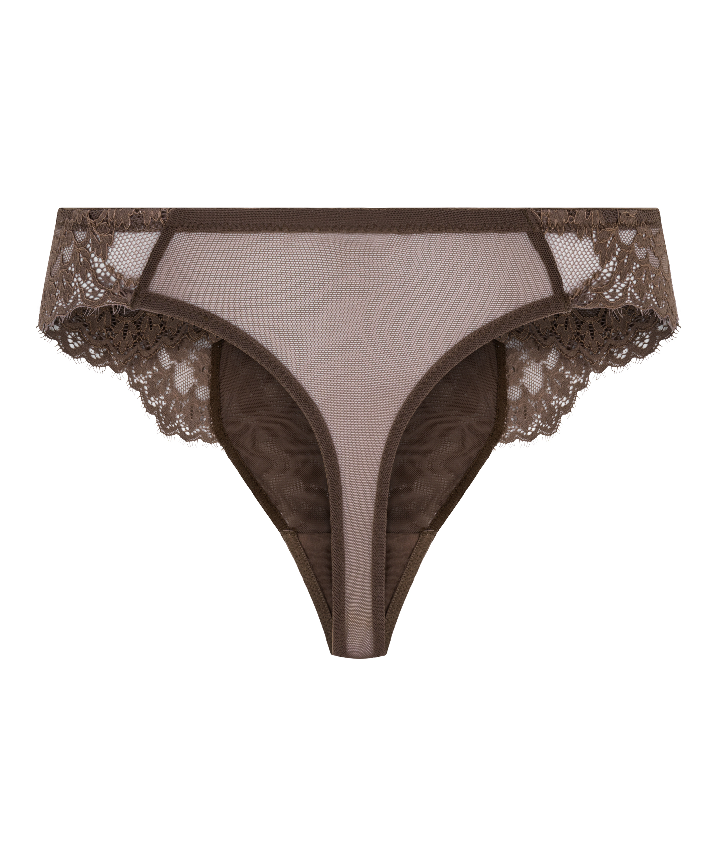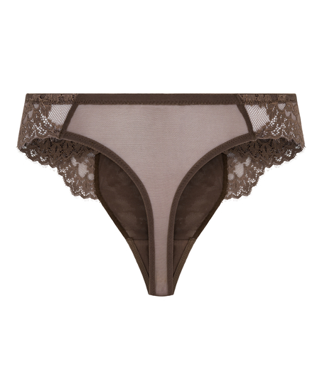 Dieser trendige String ist vorne aus transparenter Spitze und hinten aus einem Mesh-Stoff. Ein kleiner Knopf in der Mitte der Vorderseite sorgt für den letzten Schliff.