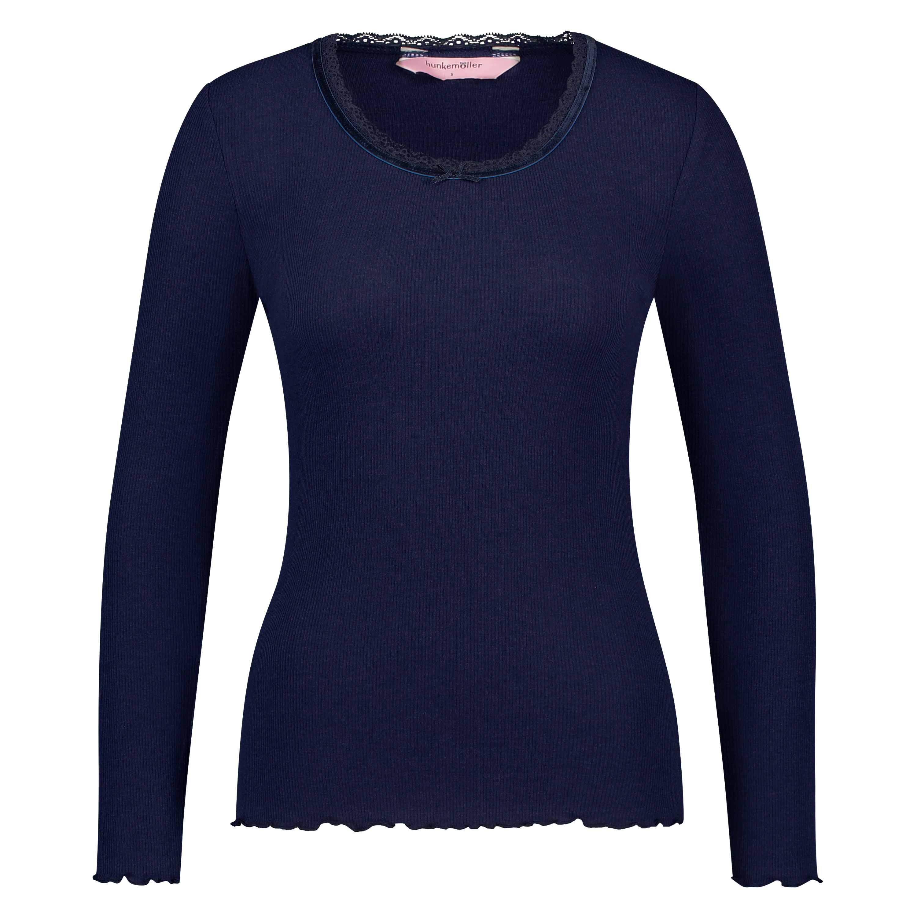 Top à manches longues à motif côtelé. Top à décolleté arrondi décoré d’un liseré de dentelle.